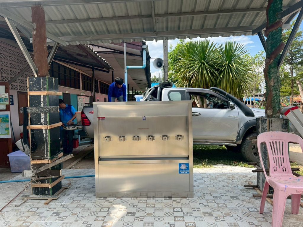 ติดตั้งถังกรองสแตนเลสขนาด 30 × 120 CM จำนวน 3 ใบ บรรจุสารกรอง พร้อมเปลี่ยนไส้เมมเบรน ปรับปรุงระบบไฟฟ้า ประปา